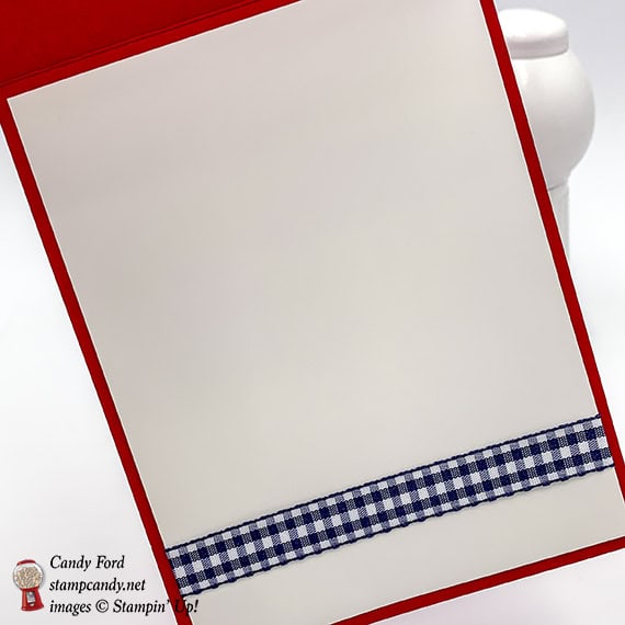 - gingham ribbon adhered onto the Night of Navy CS layer using Tear & Tape, wrapping the ends around to the back
