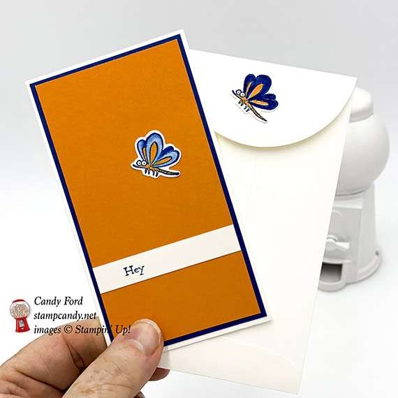 I colored two dragonflies in Blueberry Bushel and Pumpkin Pie: one of then directly with the markers, and the other one with a Blender Pen. I like the way both of them came out, but not necessarily side by side. So I opted to put one on the card and one on the envelope.