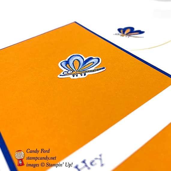 Unfortunately, this wasn’t on purpose. I finished the card and took it upstairs to photograph it, when I realized I had adhered the card front upside down. Oops! If I had glued the Whisper White cardstock piece onto the inside before going upstairs, I would have noticed it, and may have fixed it then. But once I walked allllll the way upstairs, well, you know.