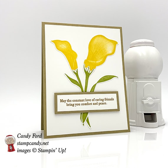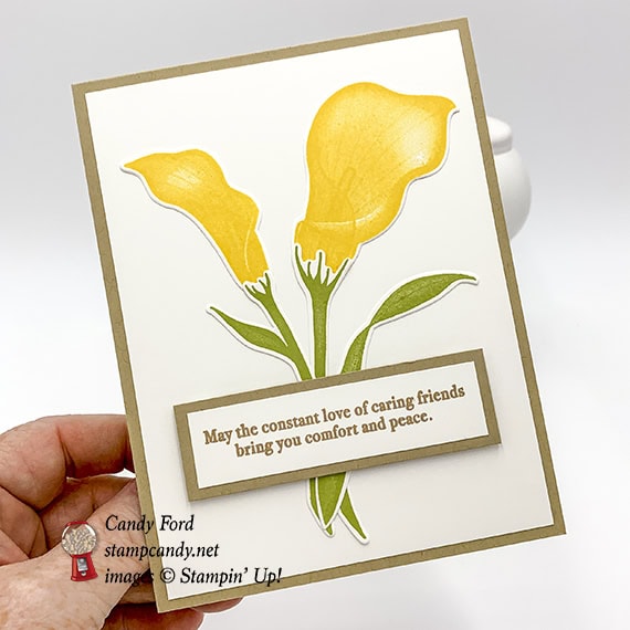 The Lily Framelits Dies will be available in March. They coordinate with the Lasting Lily stamp set, which has been very popular. It’s really gorgeous and has lots of sentiments for times when you just don’t know what to say. And with the dies, you can do so much more with the stamps! I made a pretty simple card for today. I wanted it to be calm and soothing.