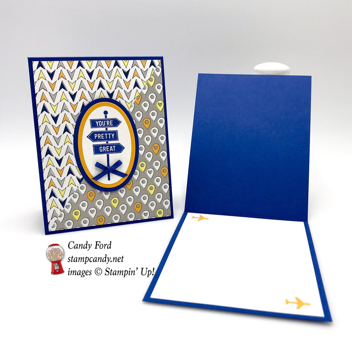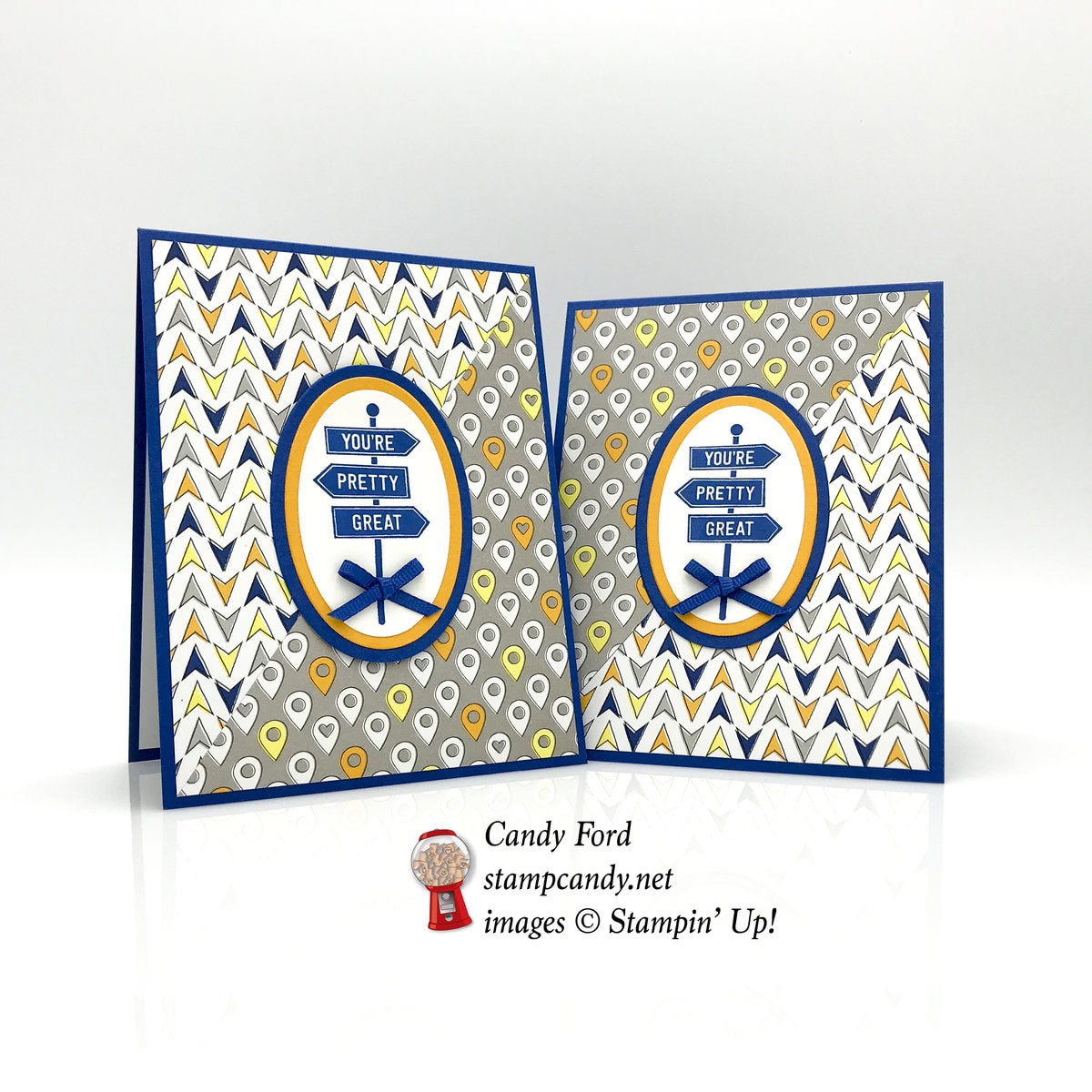 - Best Route Designer Series Paper (DSP) cut to 4″ x 5-1/4″ (2 different patterns), then both pieces cut in half diagonally from corner to corner