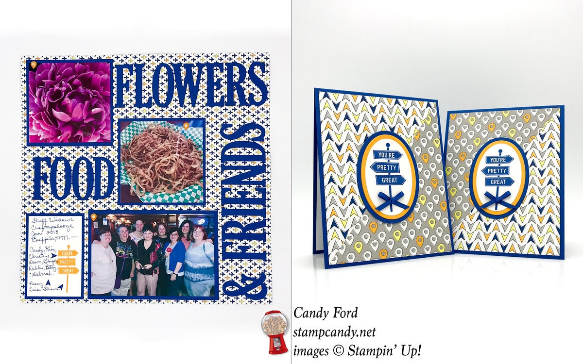 This month on the OSAT Blog Hop, we are featuring scrapbook page layouts. I think a lot of people think of Stampin’ Up! products as only for card making. Of course, they do make amazing cards, but they can also be used for scrapbooking, or memory keeping. I’ve used the Best Route suite to create a scrapbook page and coordinating cards .