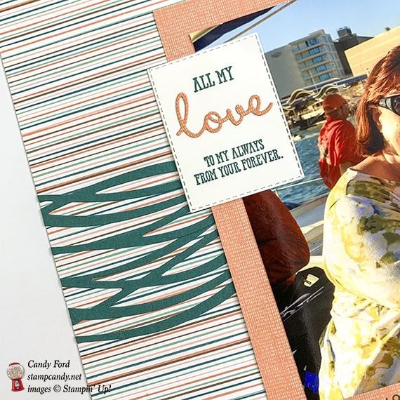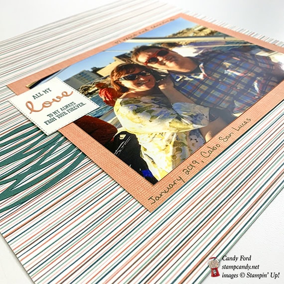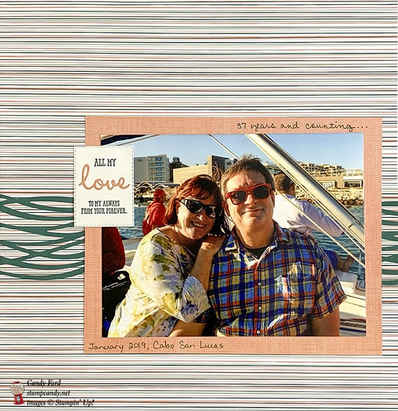 This month the Scrapbooking Global Blog Hop has a theme challenge: Love & Marriage. My page definitely has a love theme, but not necessarily marriage, unless you count the note I made above the photo of how long hubby and I have been together. I used the Nature’s Poem Designer Series Paper because I thought the colors went well with the photo (I must say it looks better in person than in my pics below.) The Well Said Bundle, plus a couple more die sets, Rectangle Stitched Framelits and Swirly Scribbles Thinlits, added the accents. I always try to add some handwriting to my scrapbook pages, and I used a Tranquil Tide Stampin’ Write Marker for this one.