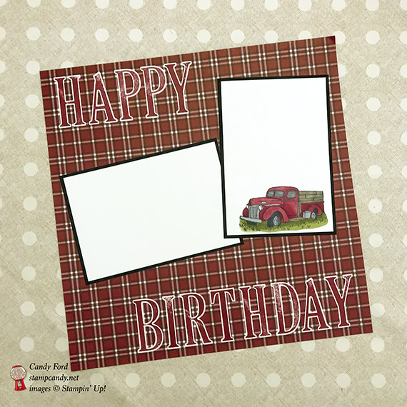 I’m excited to join the Scrapbooking Global Blog Hop for September! This month’s theme is Masculine pages. I thought, what’s more masculine than a plaid flannel shirt and an old pickup truck? The plaid background paper (I’m pretending it’s flannel) is from the new Festive Farmhouse Designer Series Paper, and the truck is from the Country Livin’ stamp set. I don’t have photos on the page because the birthday for which I made this page hasn’t happened yet. But I have the photo mats ready, so all I have to do is adhere the photos: one 6″ x 4″ and one 4″ square (above the truck.) For now it’s safe and sound in a pocket page in my scrapbook.
