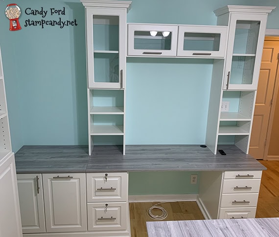 Here’s my desk. The area at the left is for the printer, and the cabinets underneath it have (left) a pull out shelf for my shredder and (right) a pull out trash can.