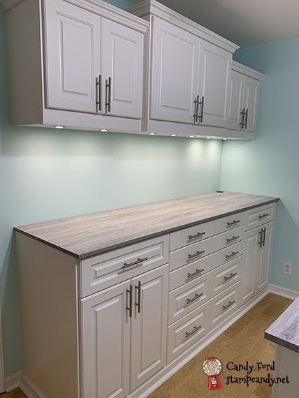 This will be the photo (and hopefully video) area. The puck lights over the counter work by remote and are dimmable (although I don’t know why I would ever want to dim them!)