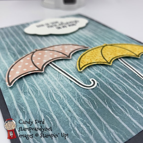 - sentiment and 2 umbrellas adhered onto the DSP layer using Stampin’ Dimensionals