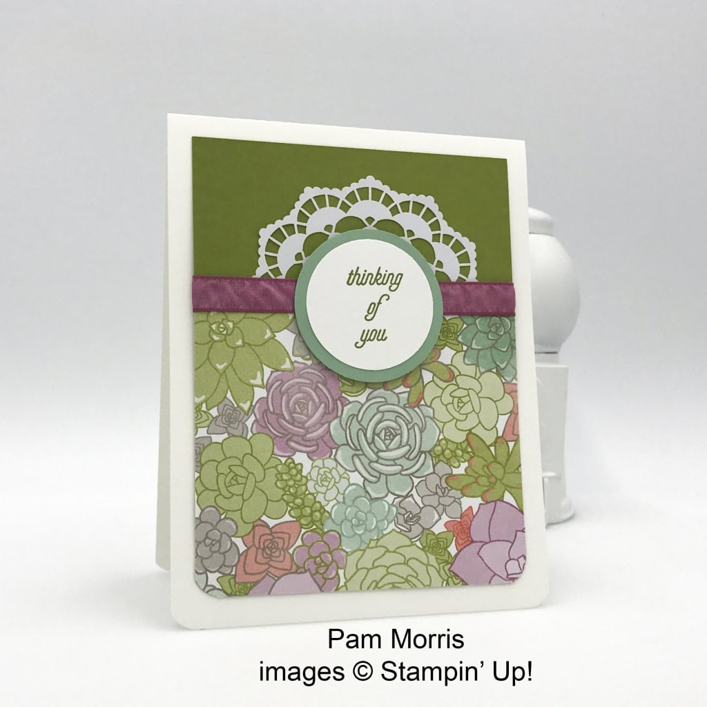Gorgeous. Stunning. Amazing. You know, all those good words. They’re what I use to describe the Succulent Garden Suite of products in the 2017 Occasions Catalog (pages 20-21.) Even the word Succulent sounds so rich and beautiful. I used the Oh So Succulent stamp set and the Succulent Garden Designer Series Paper (DSP) to create today’s card. It was my swap card at a team meeting I attended Saturday. You can see more of the team swaps here. Scroll down to bottom of today’s post to see all the products in this suite.