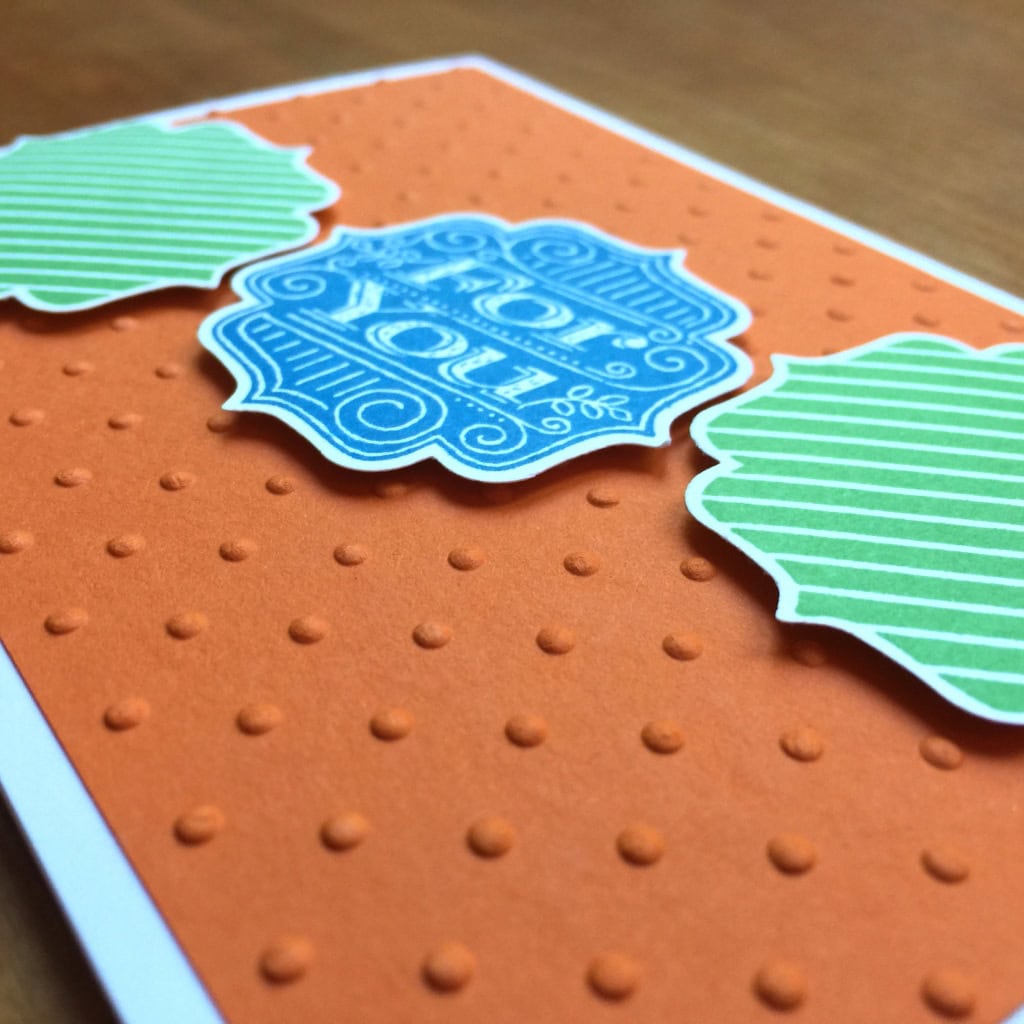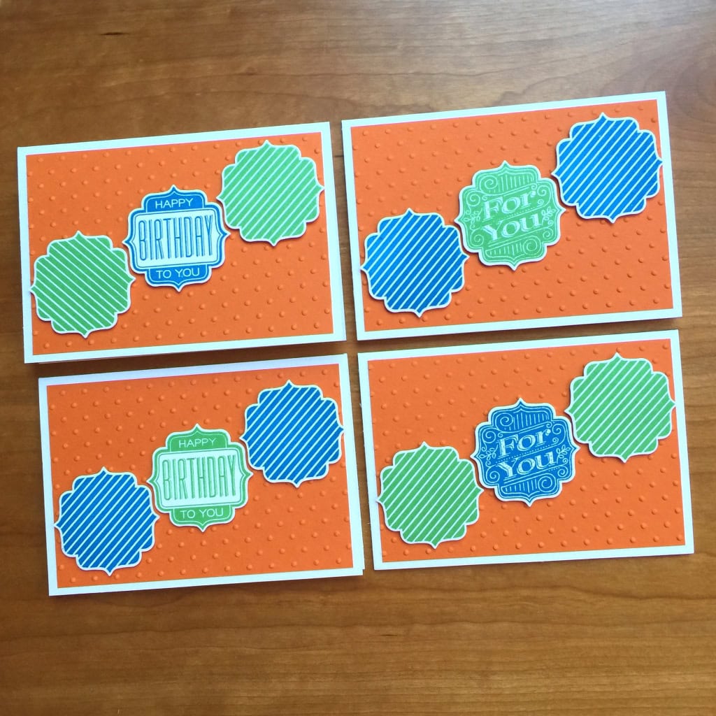Today I whipped up four cards in about the same amount of time it would take to make just one. It took only four Whisper White note cards and envelopes, one sheet of Tangelo Twist card stock, half of one sheet of Whisper White card stock, three stamps from the Tag Talk stamp set, two colors of ink (Pacific Point and Cucumber Crush,) one embossing folder (Perfect Polka Dots,) and the Bracket Label Punch…and a par-tri-idge in a pear tree. Sorry, I couldn’t resist.