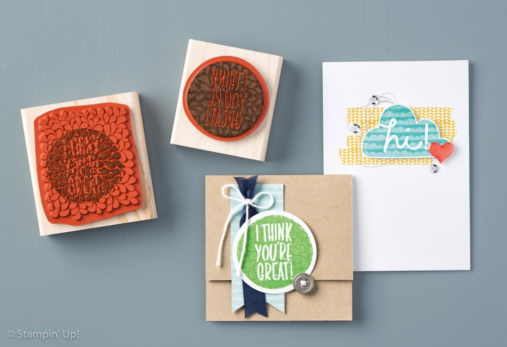 Here’s a closer look at the I Think You’re Great stamp set. You can buy it in wood or clear mount, or in French, by clicking on the product images below.