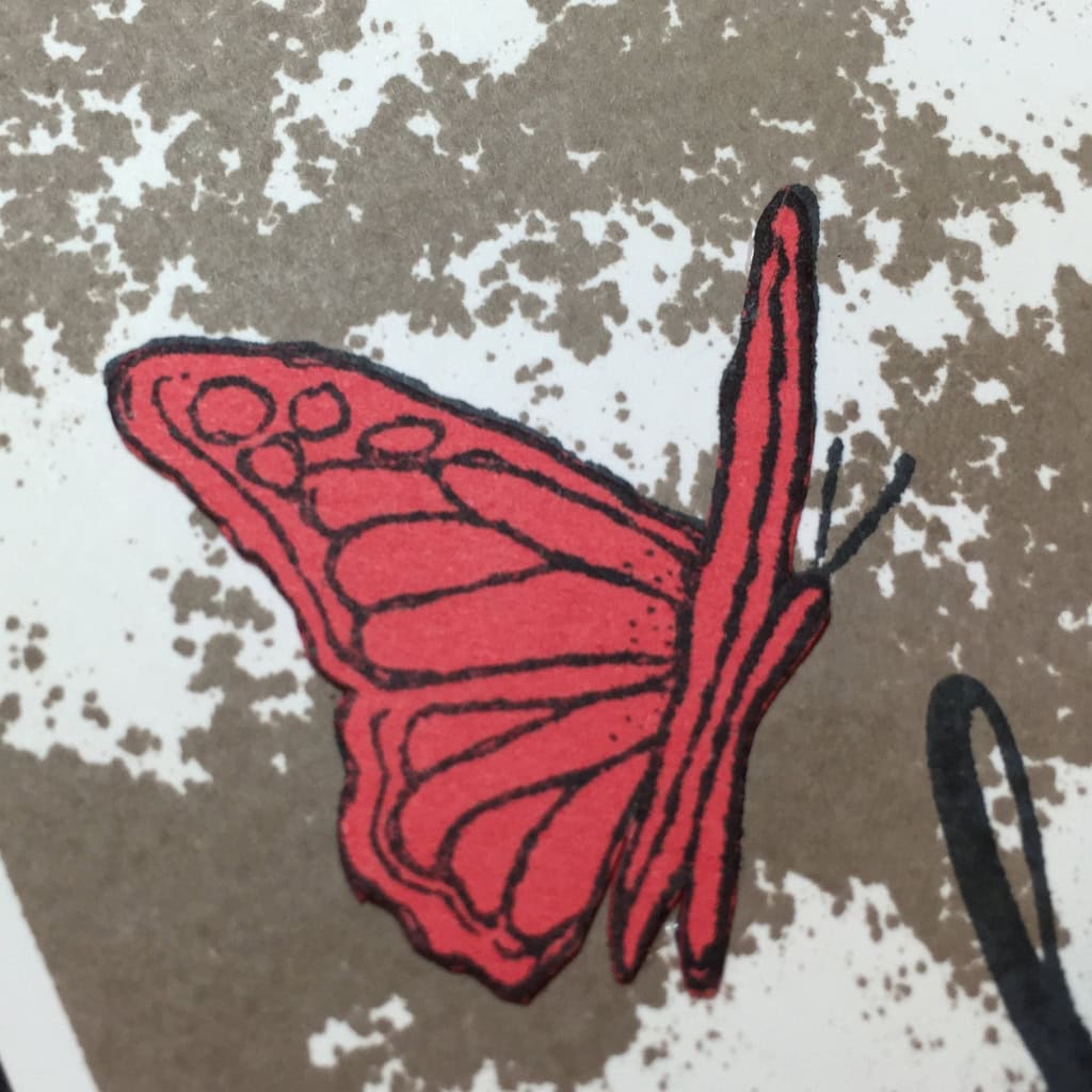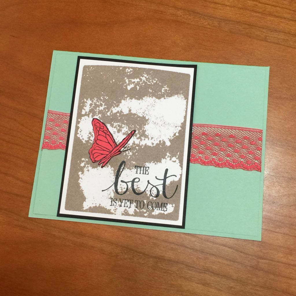 Both the sentiment and the butterfly are from the Best Thoughts stamp set, available to purchase with Stampin’ Rewards. I stamped them both with black Memento ink directly over the Tip Top Taupe background. I then stamped the butterfly again, this time on Watermelon Wonder card stock, then fussy cut it and glued it over the first stamped image. I had considered adhering it with Stampin’ Dimensionals, but decided the skinny bits of the image would be difficult to prevent from getting bent. So you could just adhere the fussy cut butterfly without stamping it first on the background piece.