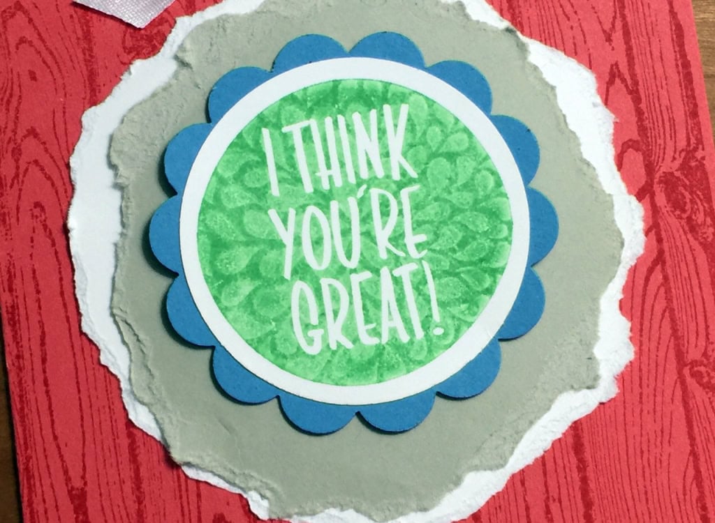 It’s really quick and easy, and you know I love that. First I inked up the solid “I think you’re great” stamp, then pressed it against the clean floral/leafy stamp. Some of the ink transferred to the clean stamp, leaving a lighter pattern on the solid stamp. Then I stamped it on Whisper White card stock, and here’s the result.