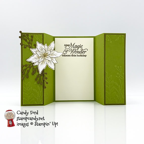 Today I’m sharing a card I designed as one of the Make & Takes for our August Candy Hearts team meeting. I used the Poinsettia Place Suite Collection to create this double gate-fold card. At 3″ wide, it’s skinnier than the usual 4-1/4″, but that leaves room for the sprigs to hang off the edge. It will still fit into the standard medium envelope. The poinsettia was die cut from the Poinsettia Place Designer Series Paper, and glued onto a piece of card stock that was cut with the same die. That’s to make it sturdier, since half of it hangs off the layer.