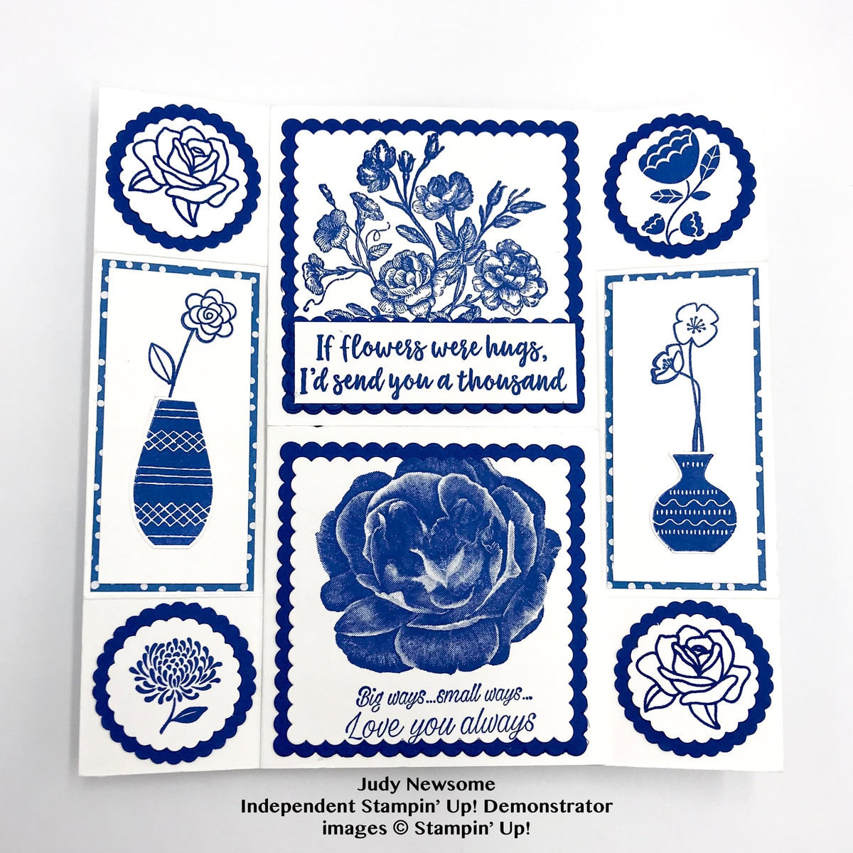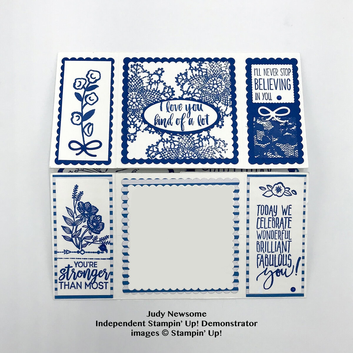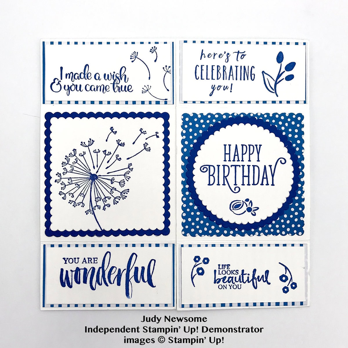 My birthday was one month ago today, so I guess it’s about time I posted another birthday card I received, eh? This one is from Judy Newsome, an incredibly talented member of my Candy Hearts team (and my big sister!) It’s an infinity card. You begin by opening the front page to the sides, like French Doors. Then you open the next page vertically. Then horizontally, then vertically, until you get back to the front. She used my favorite current Stampin’ Up! color, Blueberry Bushel. When I saw everything she used to make this card (take a look at the products listed near the bottom of this post!) and realized the time she spent putting it all together, well, talk about feeling loved! I sure do! Thanks again, Judy!