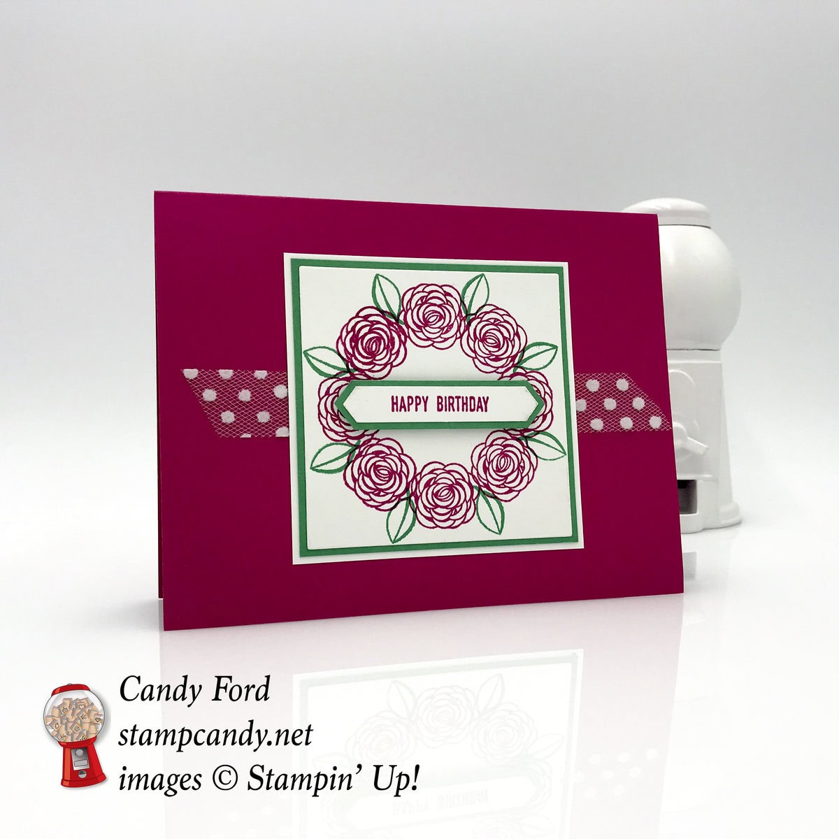 Today I’m sharing one of the examples I made for the day I spent with the Stamp or Dye group. You can see my post about our gathering here. I used the Happy Birthday Gorgeous stamp set for the flowers & leaves of the wreath, and the Itty Bitty Greetings stamp set for the sentiment, which I cut using the Classic Label Punch.
