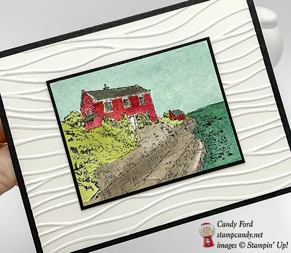Today I’m sharing another card I made using the By the Bay stamp set with inks and an Aqua Painter. I used the same colors to watercolor the stamped image as I did before, but I cropped it down and matted it with Basic Black cardstock and put it on an background embossed with the Seaside Textured Impressions Embossing Folder. It’s amazing to me how different the two cards look. You can see the first one here.