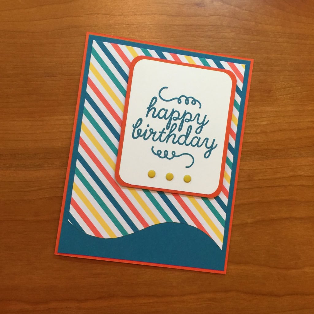 This month’s Paper Pumpkin kit makes gift bags and cards perfect for birthdays and other occasions to celebrate. I cut pieces from one of the cards and put them on a Tangerine Tango card base. The sentiment is stamped in Island Indigo on Whisper White, then matted on Tangerine Tango. I rounded the corners with the Project Life Corner Punch. Three Daffodil Delight Candy Dots finish it off.