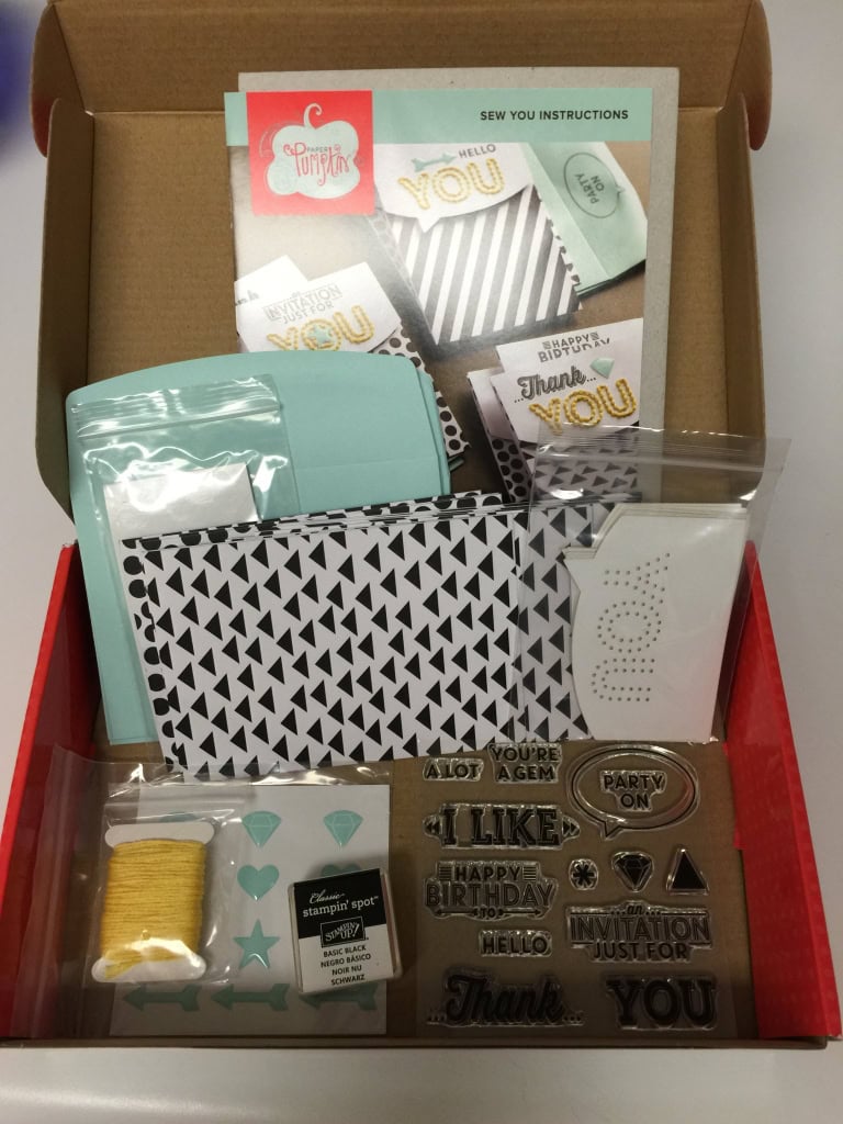 Every month I get so excited when I see that orange box in the mail, because I know it’s gonna be chock-full of stampin’ fun. This month is no exception. Here’s a peek at what all comes in the box.
