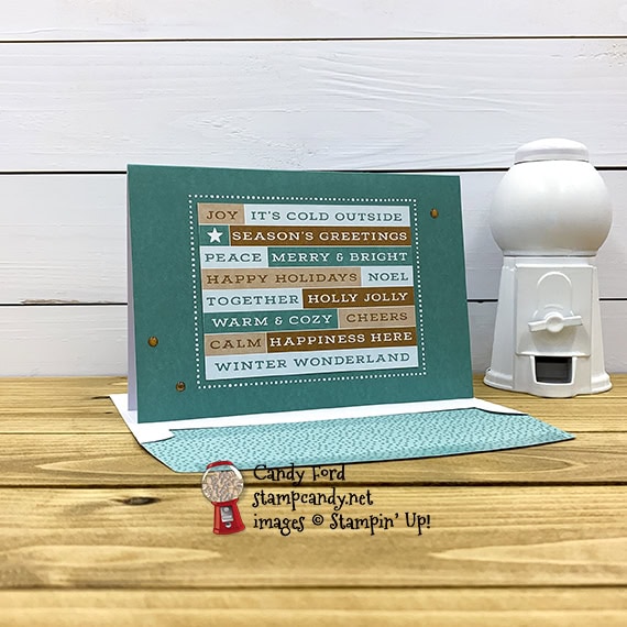 Today’s card is another quick and easy one I made using the Flowers for Every Season Memories & More Cards & Envelopes, Flowers for Every Season Memories & More Card Pack, and 2020-2022 In Color Enamel Dots. The card base and matching envelope are Just Jade, and the M&M card on the front has a winter/Christmas theme.