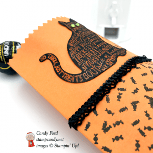 Continuing with the Halloween theme of this week, today’s project is a bag full of yummy treats. I made the bag using the Mini Treat Bag Thinlits Dies, Graveyard Gate stamp set, Spooky Cat Bundle (Spooky Cat stamp set and Cat Punch,) Black Mini Sequin Trim and Vintage Crochet Trim. If you like giving little treats and gifts, you should definitely own the Mini Treat Bag Thinlits. Then all you need is card stock (CS) or Designer Series Paper (DSP) to create all the bags you need!