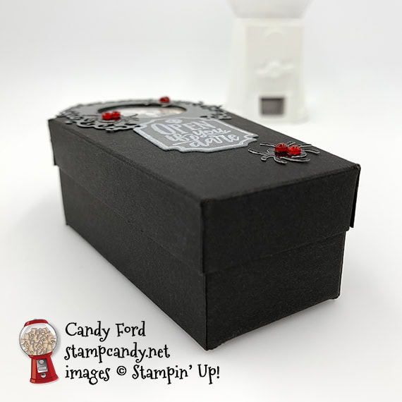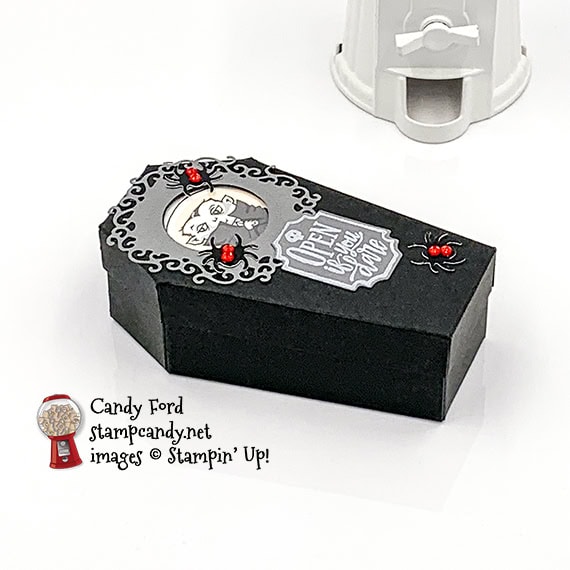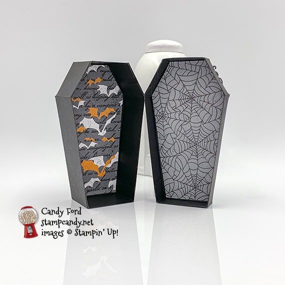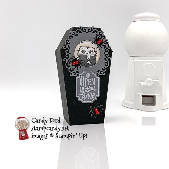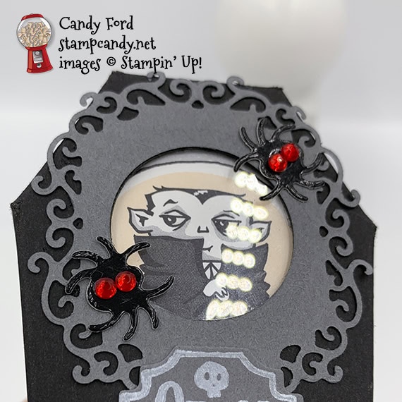 Today’s project is a fun little treat box shaped like a coffin. Stampin’ Up!’s new Coffin Boxes come pre-cut and scored, so you only have to glue the corners to assemble them. There’s a window in the coffin lid so you can see its occupant, a vampire from the Monster Bash Designer Series Paper (DSP.) The coffin is lined with more of the DSP, and the spiders on top are cut from a Black Foil Sheet using the Wicked Dies.