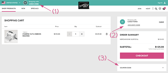 - If you have a Coupon Code from Stampin’ Up!, enter it before Checkout. (3) on image below.