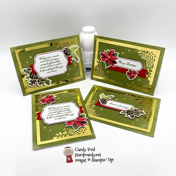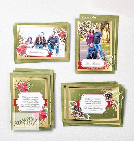 Today I’m sharing a sneak peek of the Joy of Sharing Card Kit from the August – December 2020 Mini Catalog. It’s an All-Inclusive kit, which means it contains everything you need to make the cards. The kraft box contains 15 card bases (5″ x 7″,) 15 envelopes, gold foil die cuts, printed die cuts and labels, stamp set, clear acrylic block, Mossy Meadow ink pad, gold glitter dots, and adhesives. You get way more of the die cuts than you need, so you can use them on even more projects, and really spread your Joy of Sharing this holiday season!