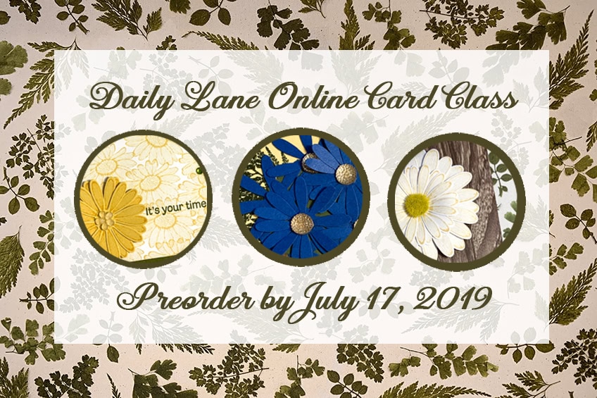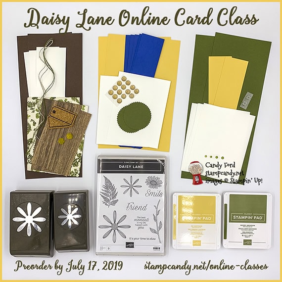 The new Daisy Lane bundle (Daisy Lane stamp set and Medium Daisy Punch) coordinates with the larger Daisy Punch that carried over from the previous catalog. In this class, you’ll use these products to make 6 floral cards (2 each of 3 designs) for assorted occasions.