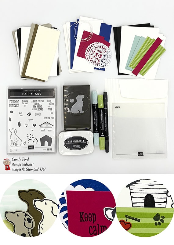 Happy Tails is a set for cute doggies! How pawsome is that? This is a Two-Step Stampin’ set. Combine individual stamps to create the final image you want in the colors you want. If you or someone you know is a dog lover, this class is for you! Make 6 cards (2 each of 3 designs.)