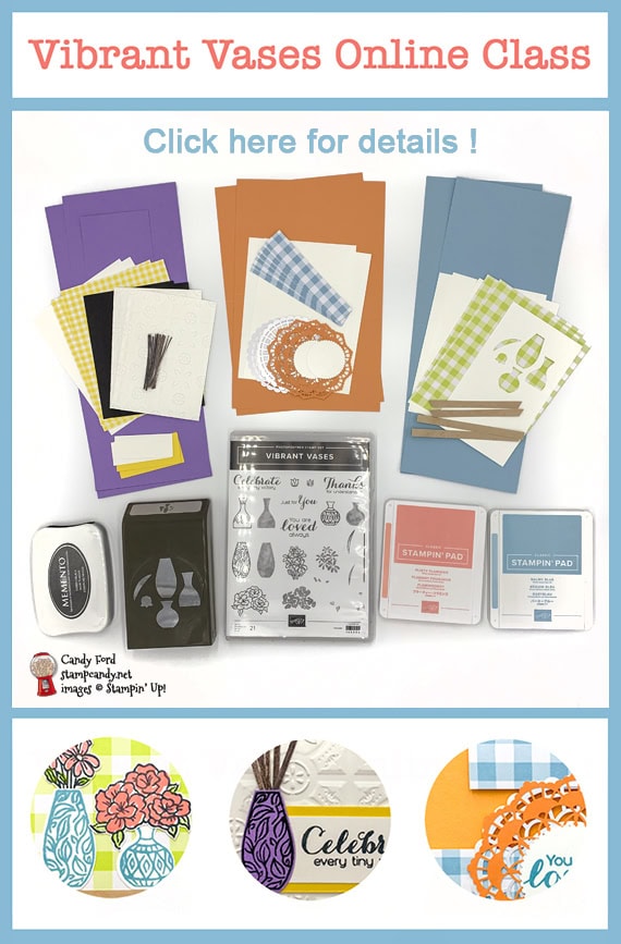 The Vibrant Vases stamp set is really versatile, especially when you pair it with the Vases Builder Punch. In this class, you’ll use them to make cards for love, celebration, and thanks. 6 cards total: 2 each of 3 designs, featuring the Gingham Gala Designer Series Paper