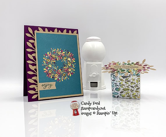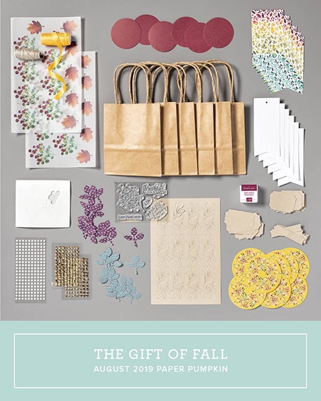 It’s time for the APPT 08-2019 Blog Hop! This month’s kit is called Gift of Fall and it is a beauty. There are lots and lots of die cut pieces to use, so you can mix and match them in many ways. There is also an Add-On Bundle available with coordinating note cards and envelopes. I used one of the note cards to create a 4-1/4″ x 5-1/2″ card, and I used tags from the kit to line a Clear Tiny Treat Box (I just love these little boxes; they’re so versatile!) Be sure to hop all the way around to all the stops of the APPT 08-2019 Blog Hop to see all the wonderful alternate projects for this month’s kit.