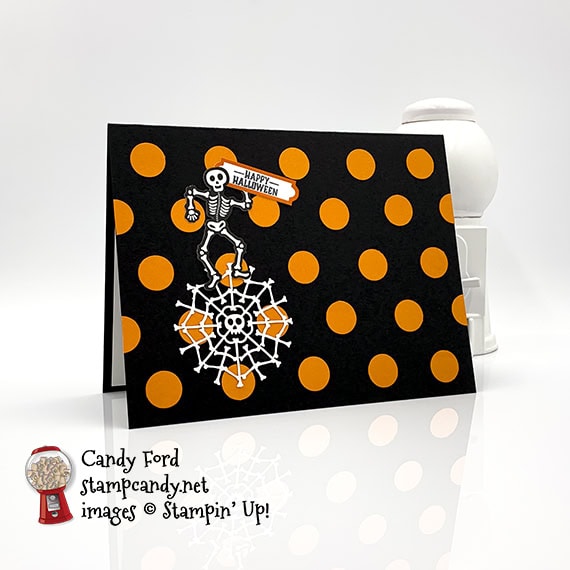 It’s time for the APPT Blog Hop for September! This month’s kit is called Bone Appétit, and it makes adorable treat boxes. I used the kit to decorate one of the boxes a little differently from the directions in the Bone Appétit kit, and to make a card that mimics the dots on the box. I love the intricate die cut “webs” of bones. And the die cut skeletons are so cute! The one on my card is holding a sign with the greeting, “Happy Halloween,” which is just one of several great sentiments in the Bone Appétit stamp set. I’ll be using this stamp set a lot, since our Halloween party theme this year is Bones!