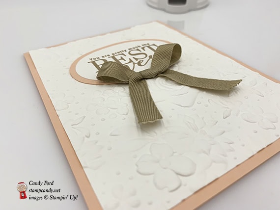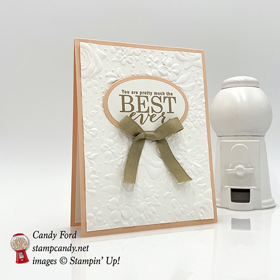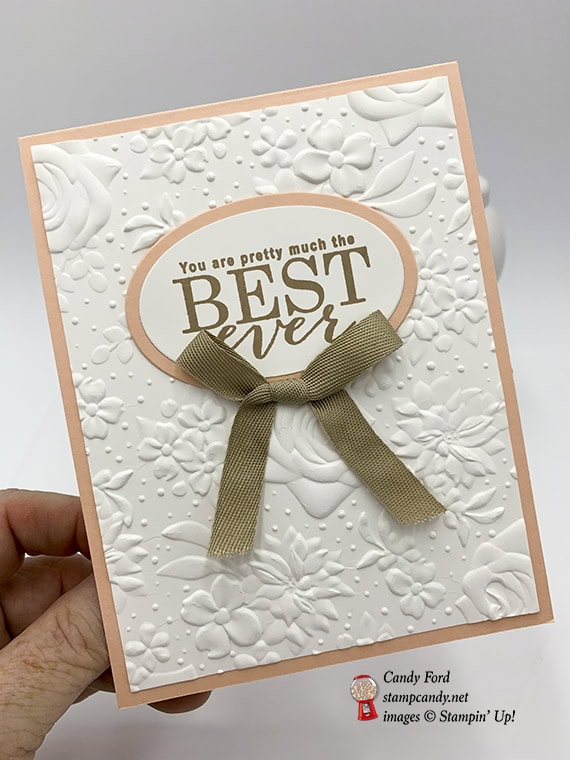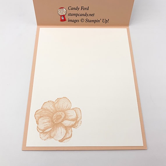 Today’s card uses all of the Sale-a-bration 2nd release tools: All Adorned stamp set, country Floral Dynamic Textured Impressions Embossing Folder, and Painted Seasons stamp set*. The sentiment is from All Adorned and the flower stamped on the inside of the card is from Painted Seasons. The embossing folder is so striking, you really have to see it in person. Everyone who has seen it so far has literally gasped. That’s how beautiful it is.