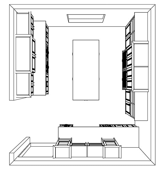 Here’s a drawing that will give you an idea of what the office redo looks like. The rectangle in the center is an island with drawers on both sides. It isn’t a very large room, and there’s only one window, so all the furniture is white, with pale grey countertops, to maximize the light.