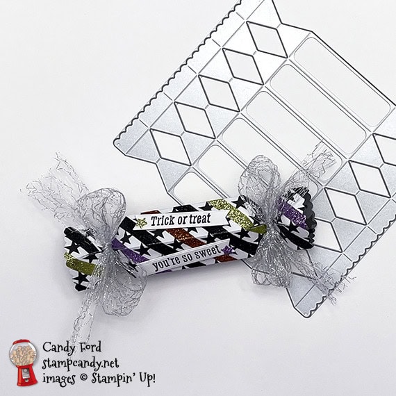 Welcome to the September 2022 Candy Hearts Blog Hop! It’s almost the time of year for all things spooky and fun. And Stampin’ Up! has all you need to make sure your treats are the cutest on the block. So today we’re sharing Halloween treat ideas. I used the Cracker & Treat Box Dies to create a cute little treat holder. I decorated some Designer Series Paper with washi tape, and added Metallic Mesh Ribbon which reminds me of silvery cobwebs. I used the Scary Cute stamp set for the sentiment – I inked only half of the sentiment at a time and stamped onto separate pieces of card stock.