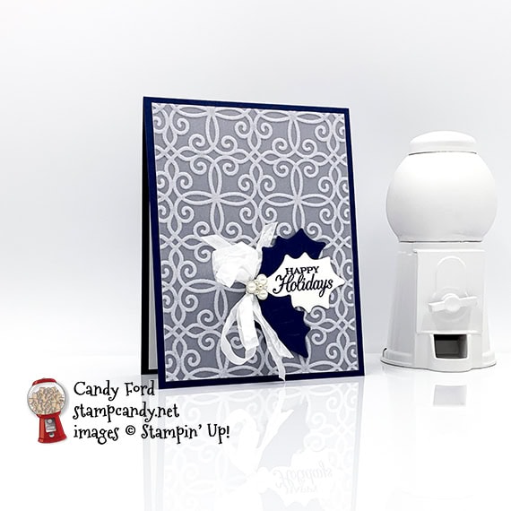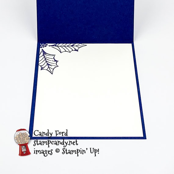 - holly leaves and berries in Night of Navy ink onto the Whisper White CS for the inside of the card base