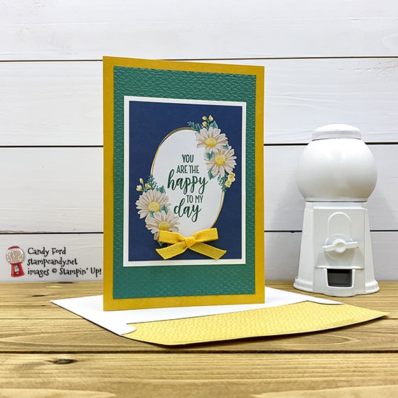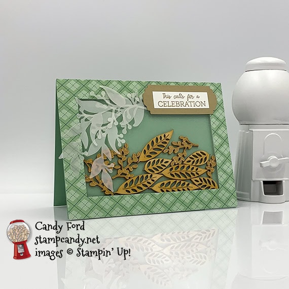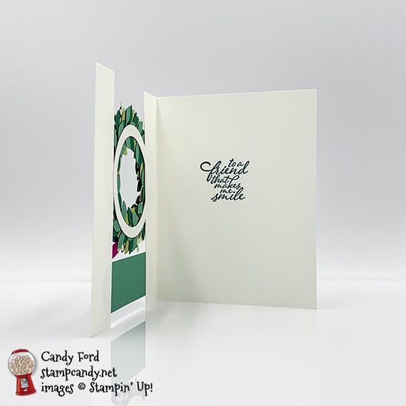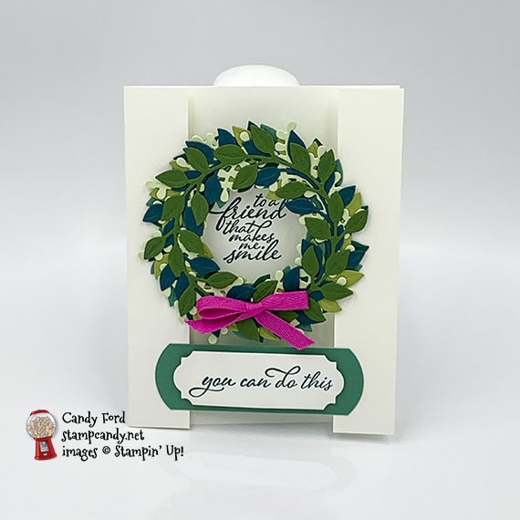 Wreaths aren’t just for the holidays. Today’s wreath card gives encouragement to a dear friend. I used the Wreath Builder Dies, Layering Circle Dies, Ornate Frames Dies, Forever Fern stamp set, and 1-1/2″ Circle Punch. And of course, several colors of card stock. The front of the card base is in two separate pieces that are held together by the wreath and the sentiment.