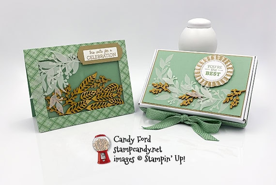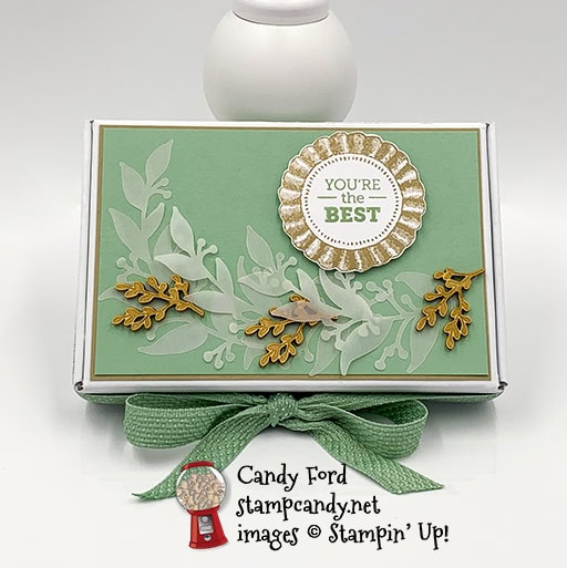 Welcome to the August 2020 APPT Blog Hop! This month we’re sharing alternate projects to make with the World’s Greatest kit. I used a Mini Paper Pumpkin Box, Mint Macaron ribbon, and In Good Taste Elements along with the kit to create a shaker card and gift box. The box is the perfect size for note cards. The colors in the kit are pretty bold and bright, and I wanted to make something calmer, so I used the Mint Macaron and white from the kit and added Crumb Cake. And I used glue and Stampin’ Seal+ in addition to the glue dots and dimensionals from the kit, but you don’t have to.