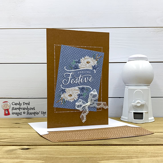 It is so easy to make pretty cards with the Flowers for Every Season Memories & More Card & Envelopes and Card Pack – you just stick one onto the other and you’re done! I’ve added extra interest to today’s project by angling the card on the front and adding a bow made with Very Vanilla Scalloped Lace Trim. It was done in no time!