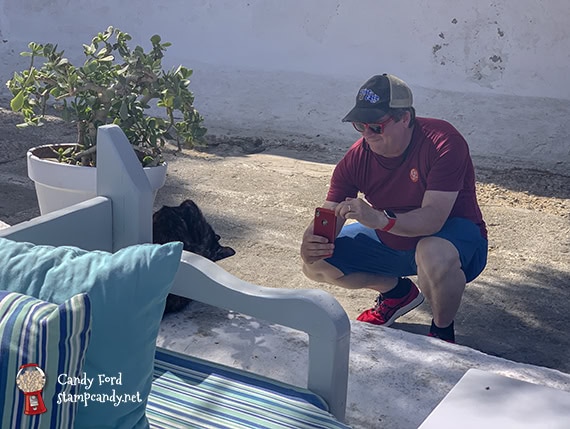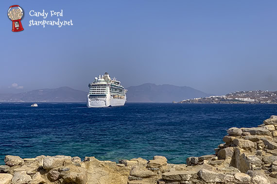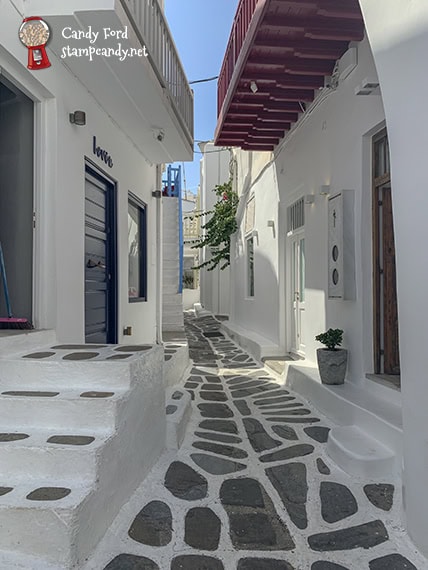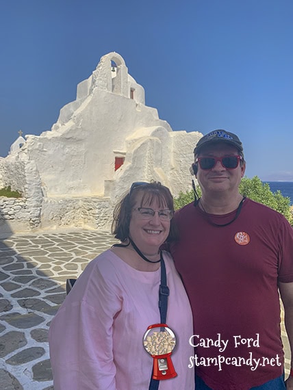 Today I’m sharing photos from our tour of the island of Mykonos, Greece. Neal and I joined a group of Stampin’ Up! folks to tour the lovely village of Mykonos and the ruins of Delos. at first our guide was commenting on how lucky we were that there was no wind, because Mykonos is known for being very windy. But it certainly started up before long. I gave up on trying to keep my hair in any sort of order. Besides it was very hot, so we were sweaty anyway. But it was a fascinating place.