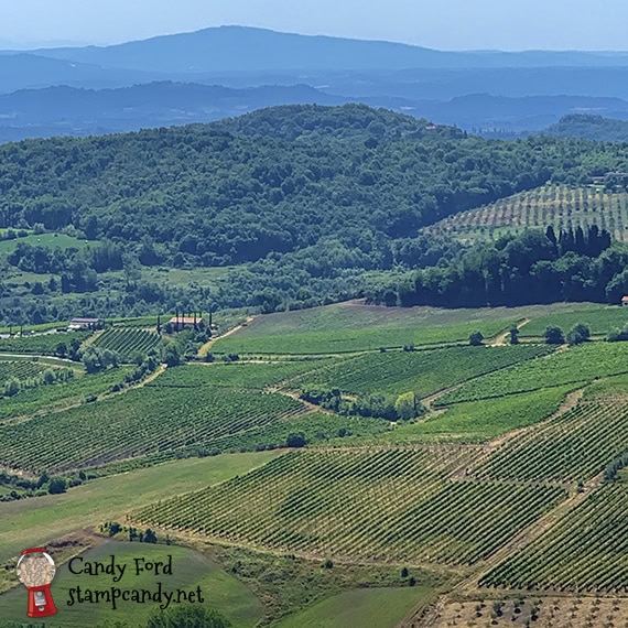 Our tour guide calls this the money shot, with vineyards, cypress trees, and rolling hills.